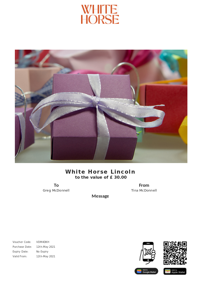 White Horse Lincoln allows you to purchase instantly printable gift vouchers, special offers and tickets using the Voucher Connect platform.